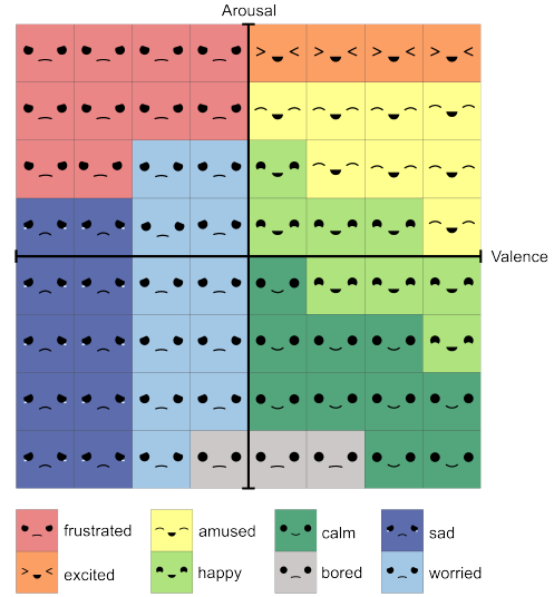 both have a range from -4 to 3. 0 being on the top of the x-aches. The emotion is then selected depending on the value combination seen above.